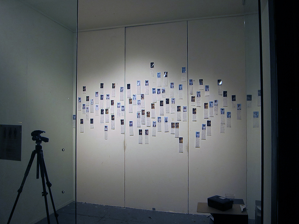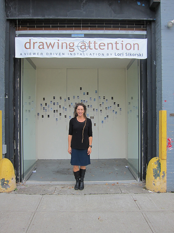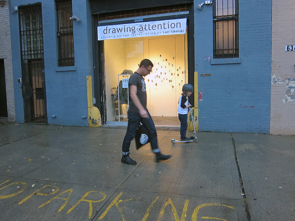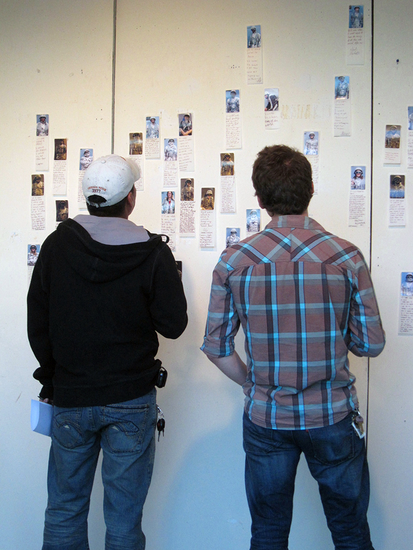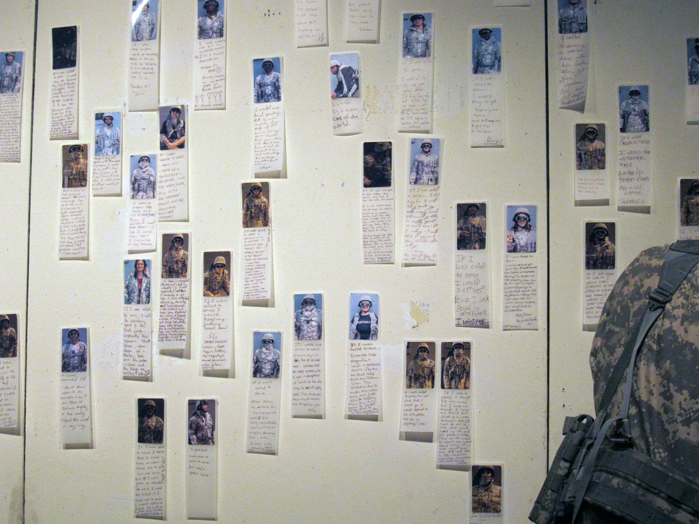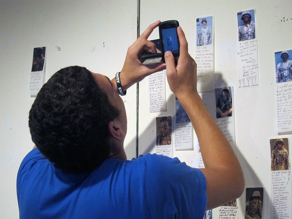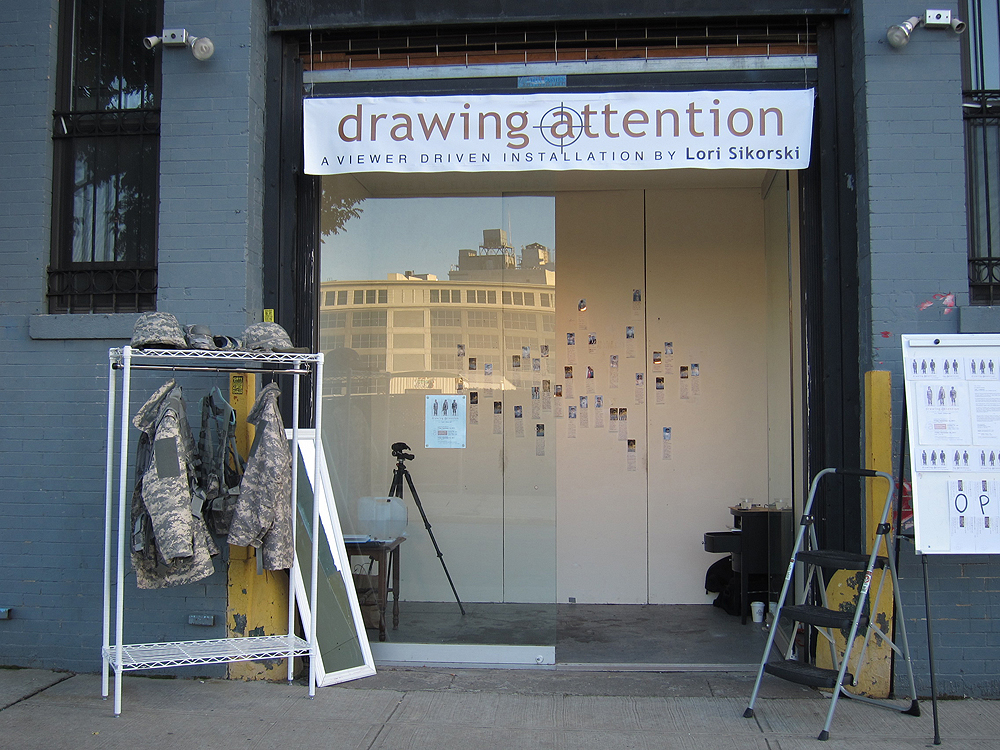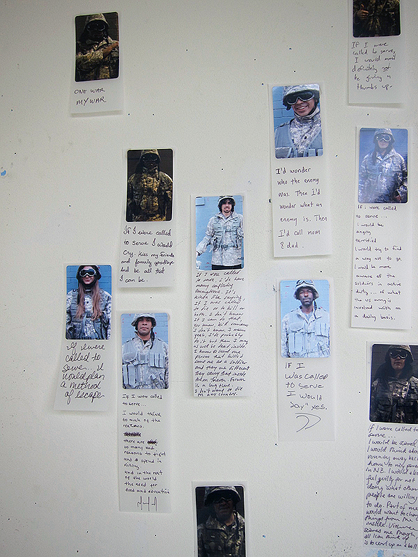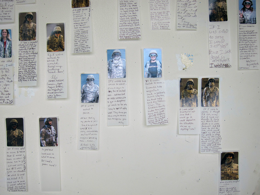 Drawing Attention is a viewer driven installation that draws on audience participation to encourage projection and self-reflection in order to better consider the role, responsibilities, and consequences of being an American soldier. In the years since 9/11, we have transitioned from an event with direct resonance to our society, a connection to an act of war that happened here, to a war being waged at a distance. “Drawing Attention” obligates viewers to pay attention to those for whom this is a continued event. By considering hypothetical service in the military, participants were compelled to confront American complacency and bystander apathy towards the 10-year “war on terror”. The audience was asked to wear provided military gear and face their transformation in the mirror. Digital photos recorded each of these ‘soldiers’. The images were attached to strips of vellum and participants were invited to write below their photo, “If I were called to serve…” The photo/text pieces were arranged on-site during the course of the exhibition.