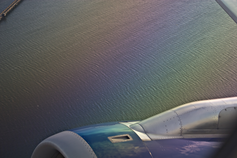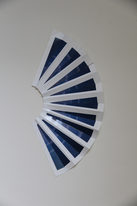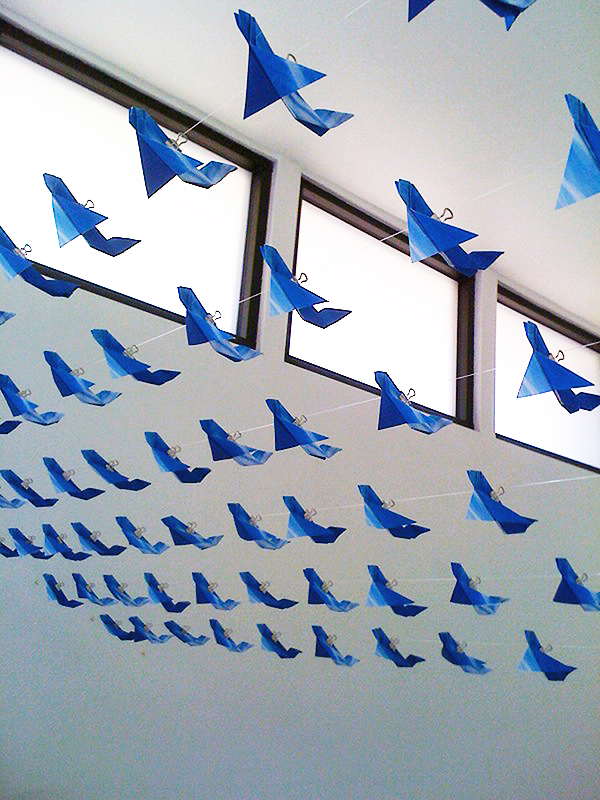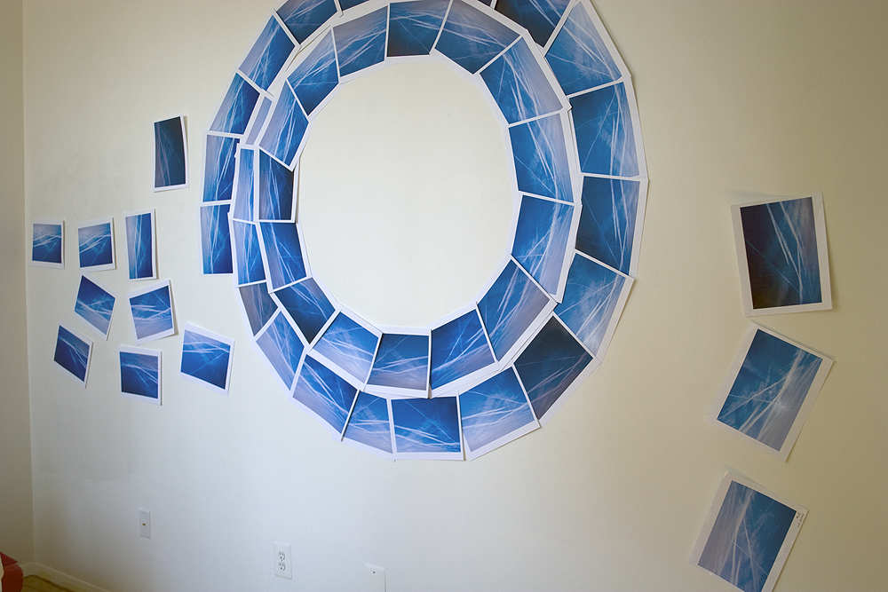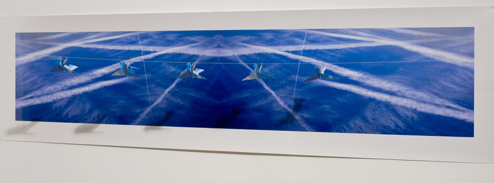 Jetting (into the) Blue is a series of works that uses photographs of the sky as image and object. The work is about air travel, yet rather than recording the ‘here’ and ‘there’ it documents the space between origin and destination – blue skies marked by jet exhaust. Photographs are used in various ways - folded into origami jet planes, placed on the wall in compositions, and mounted on aluminum. The origami jet planes installed in grid patterns imply the endless succession of flights crossing the continents. In Round and Round the photographs form an endless circle of gridded lines. Paper planes hang from a mobile, able to travel only in circles. Into the Blue is a highly saturated photograph that appeals to the adventurer spirit ‘into the wild blue yonder’. Embedded with sex appeal, it is of-the-moment, full of daring and bravado, slightly out of control and at the hand of fate. The lines of the exhaust draw us quickly in and forward, much like the impulse itself. Over the Rainbow generates a yearning and nostalgia for a place other than where we are. All the works in the series maintain an insistent emptiness that questions the meaning of an activity of created consumption with adverse environmental impact and a restless need to be someplace else.